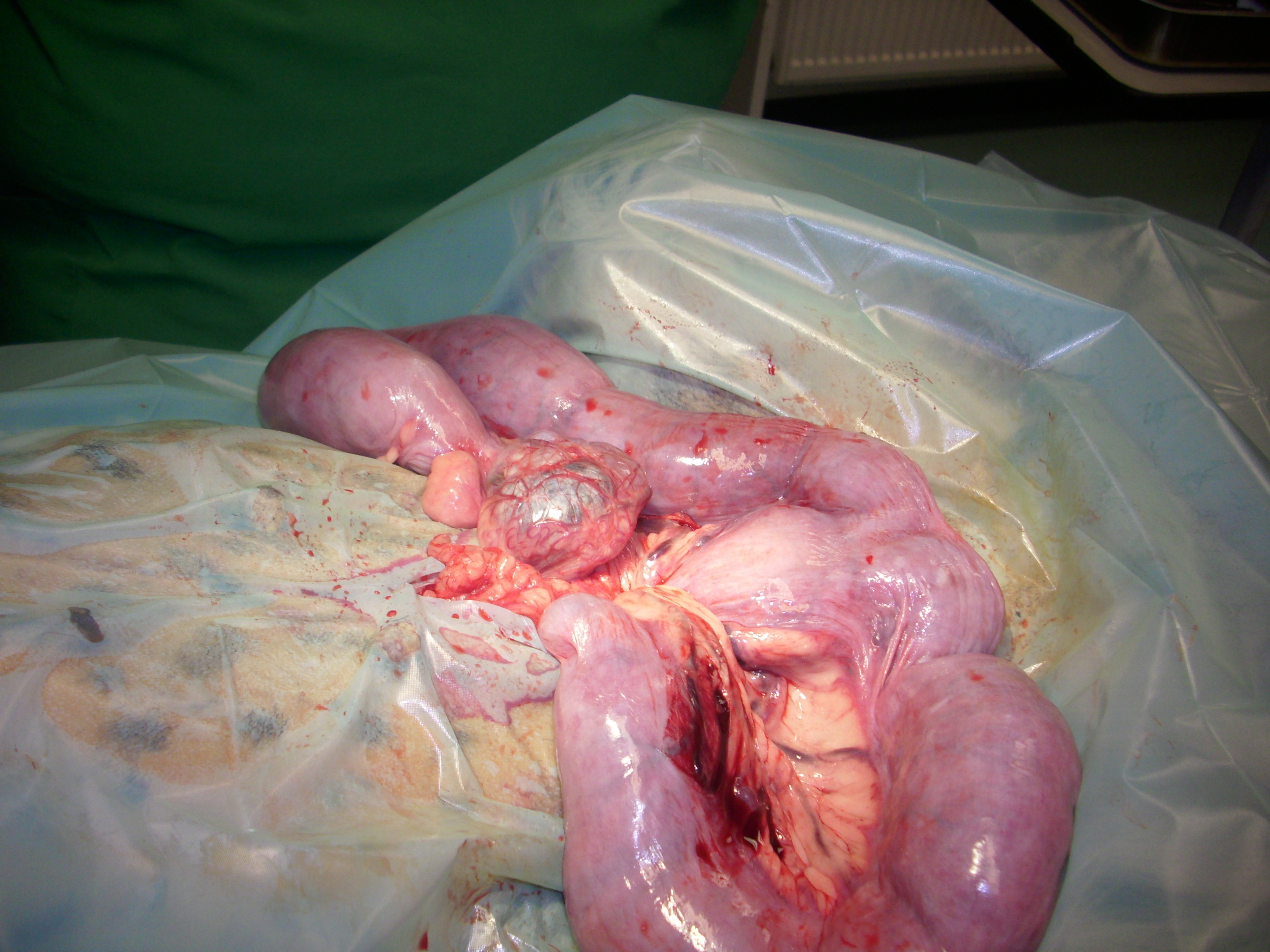 In unserer Praxis wurde eine 12-jährige Hündin vorgestellt, der es seit einigen Tagen schlechter ging und die nun bei reichlicher Wasseraufnahme das Futter komplett verweigerte. Die Temperatur war nur leicht erhöht. Die Hündin machte einen lustlosen und schlappen Eindruck. Bei der Untersuchung wurden unter anderem auch sehr angespannte Bauchdecken und eine hohe Druckempfindlichkeit im Bauchbereich festgestellt. Die Hündin zeigte keinen Ausfluss. Die Frage nach der letzten Läufigkeit konnte nicht beantwortet werden, da nie Läufigkeitssymptome bei der Hündin aufgefallen waren. Bei der Ultraschall-Untersuchung ließen sich Kinderarm dicke Gebärmutterhörner darstellen. Im vorderen Bereich der Bauchhöhle fielen erst einmal nicht zu erklärende blasige Gebilde auf. Wir beschlossen in Einvernehmen mit dem Besitzer die schnellstmögliche Entfernung der Pyometra (vereiterten Gebärmutter).